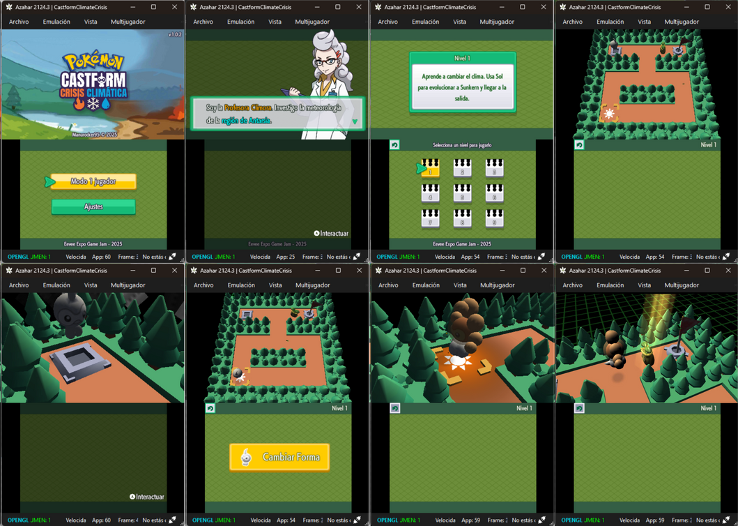 La armonía entre el fuego, el hielo y los rayos se ha visto alterada cerca de la isla Shamouti (al sur de Kanto). Esto ha llegado a la región de Antarsia y ahora se avecina una crisis climática. El papel del jugador es animar a superar todos los niveles de la simulación de la profesora Climora para ver si el poder de Castform puede utilizarse para resolver la crisis climática. Pokémon Castform Climate Crisis es un juego de puzles en el que tendrás que usar los poderes del sol, la lluvia y la nieve para superar 9 niveles diferentes.
