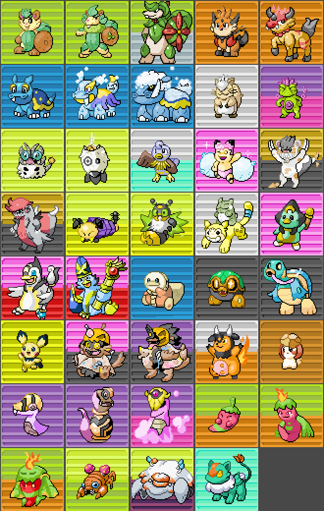 Estos son los sprites que llevo, aunque los diseños están terminados, pero, obviamente hacer los sprites tarda un poco más que dibujarlo en lápiz y papel.