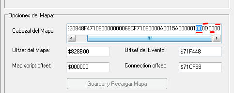 - Después buscaremos donde pone "Opciones de Mapa", fijaros en "Cabezal del mapa". Pues bien, una vez aquí debemos ir al final y contar 4 bytes, ese 4º byte empezando por el final es el que debemos cambiar.