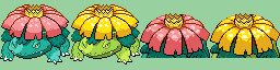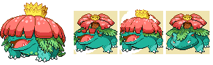 una comparación del sprite con el venusaur, la mega y el gigamax, todos están 64x64 lo subo pixeleado, por si se me lo llevan jajaja antes de terminarlo. Considero que sus tamaños están considerables, y no se ven muy pequeños uno a otros.