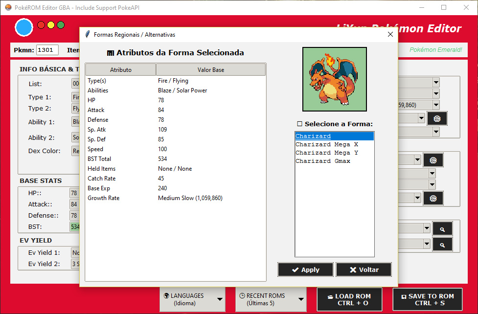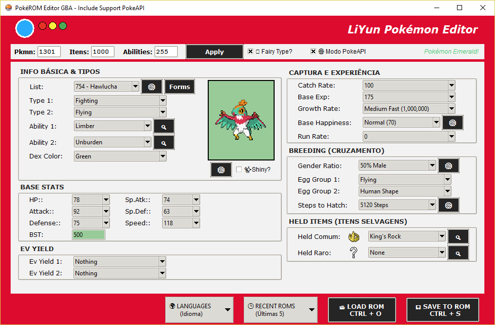 * Sprite Update via API: In addition to the stats, the program tries to download and display the Pokémon's image directly from the PokeAPI database while it is being edited. Note: This does not insert the PokeAPI sprite into the ROM; it only downloads the currently selected Pokémon's sprite as a reference.