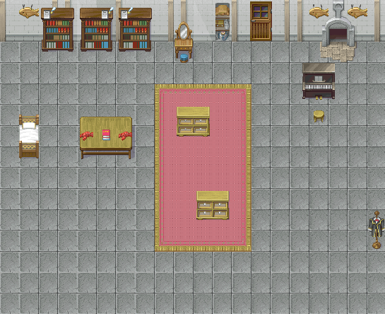 Crítica: Los tiles son mejorables, especialmente los árboles principales. El mapeado está bien, aunque es un poco cuadrado, especialmente en la forma de las montañas. El mini del protagonista me gusta. Por lo demás... está bien, con un poco de mejora puede llegar a alcanzar un buen nivel.