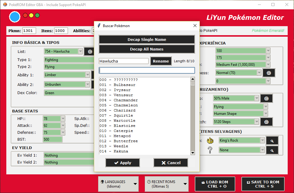 * Decap Single / Decap All: Transforma letras maiúsculas em Title Case (BULBASAUR -> Bulbasaur). Possui uma lista inteligente de exceções fixadas (Ho-Oh, Porygon2, Farfetch'd, Mime Jr.).